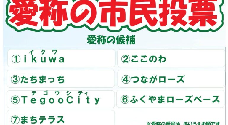 市が公表した最終候補は、あいうえお順に並べられている。①「ikuwa」は「育」と「輪」のほか、備後弁の「行くわ」や特産の「くわい」を重ねた説明が付く。②「ここのわ」は子どもから高齢者までを「和める場」という要約である。③「たちまっち」は瀬戸内方言の「たちまち」(とりあえず・まず)からの造語で、「まち」や「ち」へのかけ言葉が列挙されている。④「つながローズ」、⑥「ふくやまローズベース」はばらのまちという既存ブランドと接続する。⑤「Tegoocity」は方言「てごうする」と英語のCityの組み合わせ。⑦「まちテラス」は「照らす」とテラスを重ねた造語である。アルファベット表記案が複数あり、看板や案内サインのデザイン、検索しやすさ、読み上げアクセシビリティの観点では運用時の調整が論点になりうる。