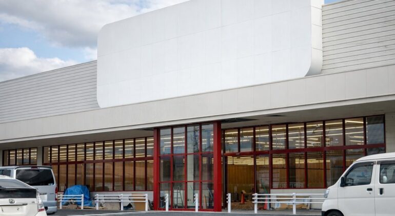 ロピア新市店(仮称)は福山市新市町戸手、旧ザ・ビッグ新市店跡地にオープンする。ザ・ビッグの閉店後、空き店舗となっていた施設を居抜き活用し、外観はロピアレッドの窓枠に塗り替え、内装は木目調のマルシェ風に改装中だ。隣接するコーナン新市店と駐車場を共有し、広大な駐車スペースを確保している。